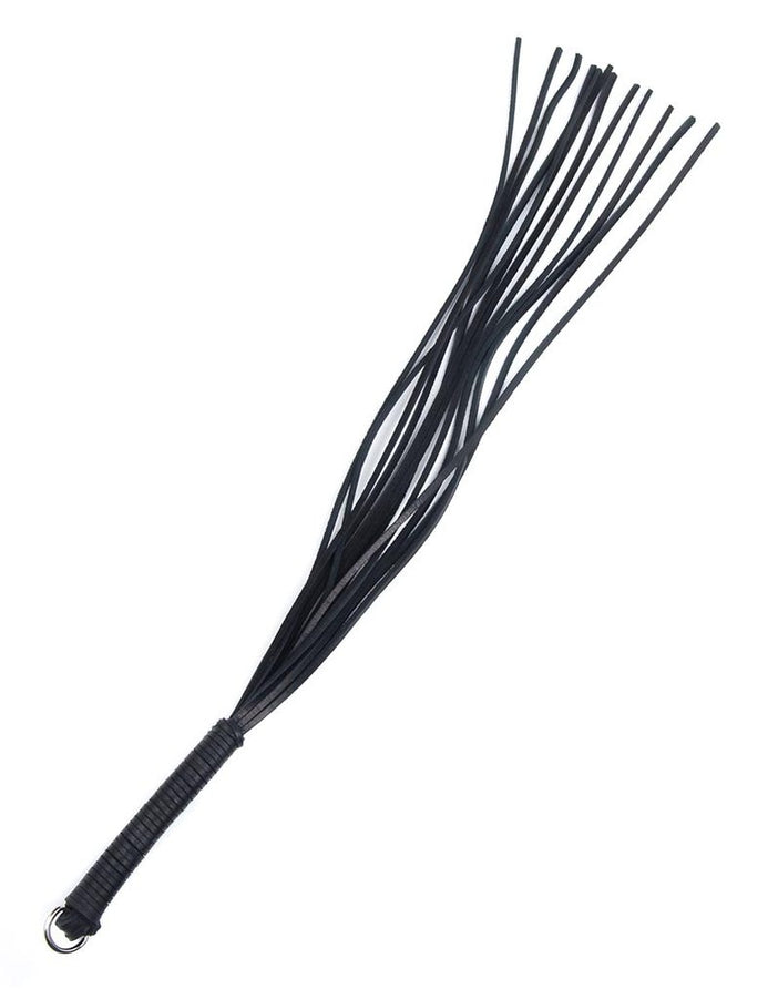 This 20" Thong Whip is made from 12 strands of black leather lacing. It has a metal D-ring affixed to the handle, making it good for hanging from a belt.