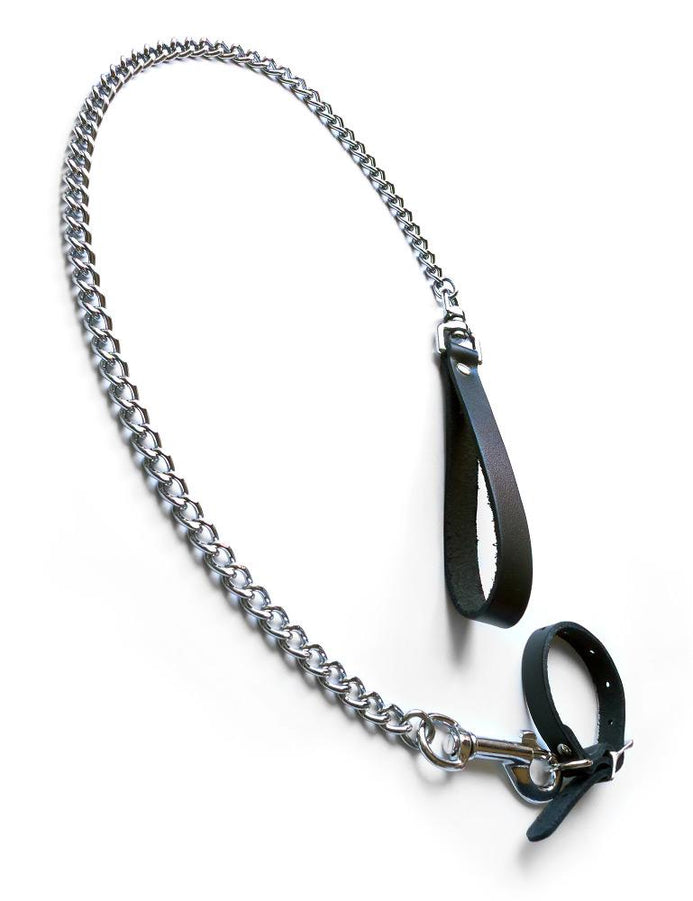 Going for a walk just got a lot more interesting. Never mind the neck, this shiny chrome leash attaches to a black leather buckling/locking cock for maximum control of your man’s most sensitive element. The leash features a leather handle, medium-weight chain with chrome snap hook, making the cock ring detachable. The leash alone may be used interchangeably with a variety of cuffs or collars.