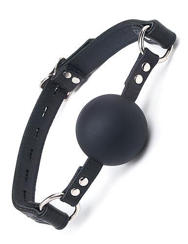 A soft black, drool-inducing silicone ball is strung onto two layers of leather......which is attached to wider leather straps with stylish and convenient D-rings, perfect for attaching reins or using as other creative points of attachments. The straps fasten in the back with a locking buckle, giving you the option for added security should you desire.