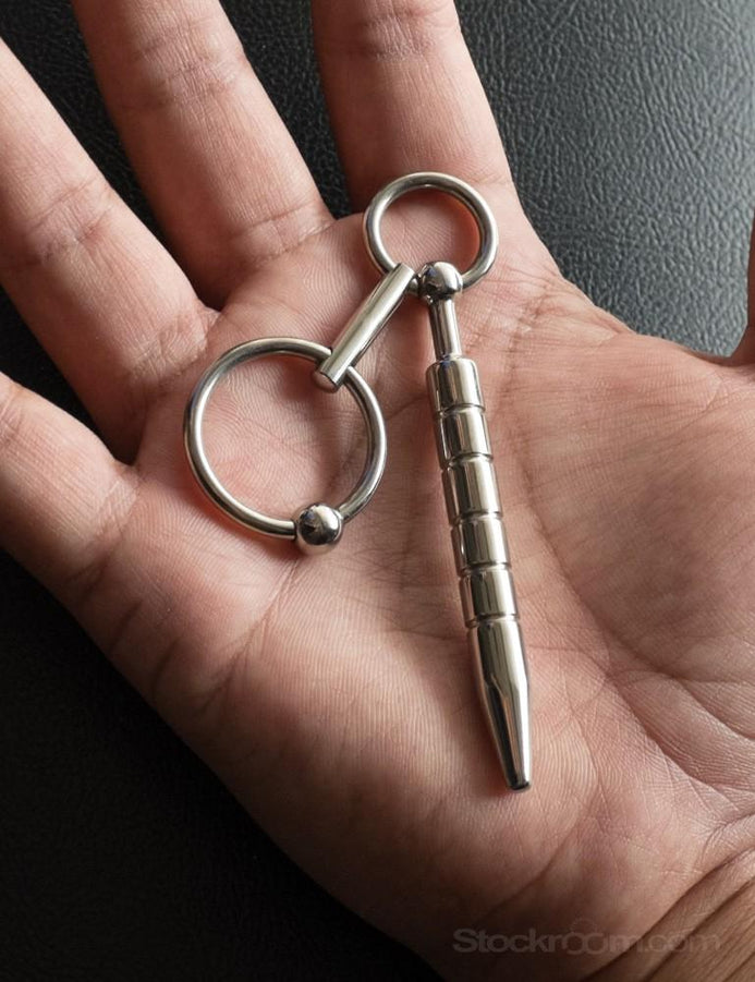 The exquisitely designed Graziano Penis Plug incorporates five grooves along the shaft of the plug for extra stimulation of the urethra. It is tapered to a rounded point for easier insertion. The plug is attached to a small hinged ring, a connecting piece, which connects to the head ring. This dual hinged attachment makes it easier to place the ring around the head of the penis.